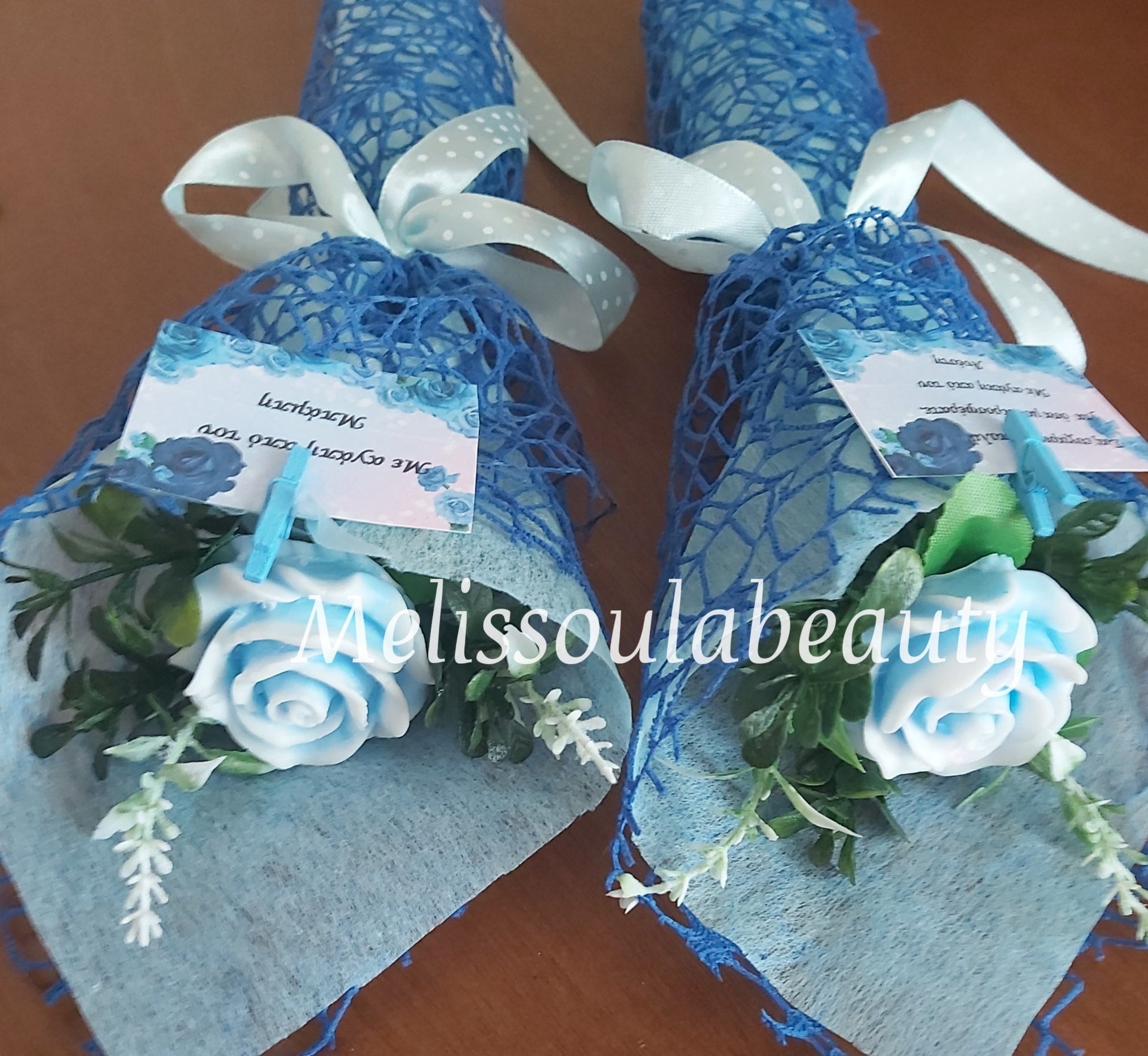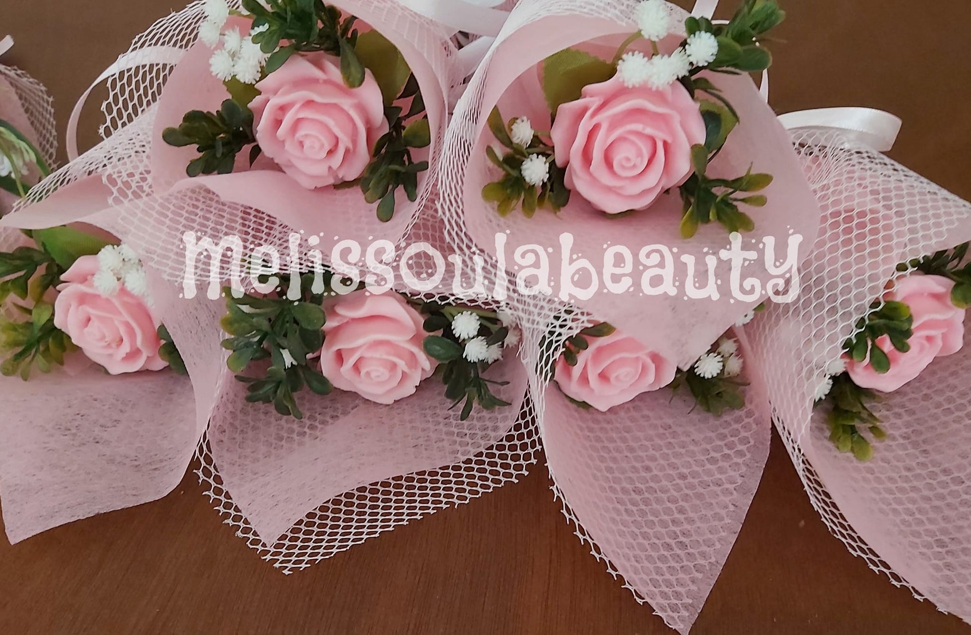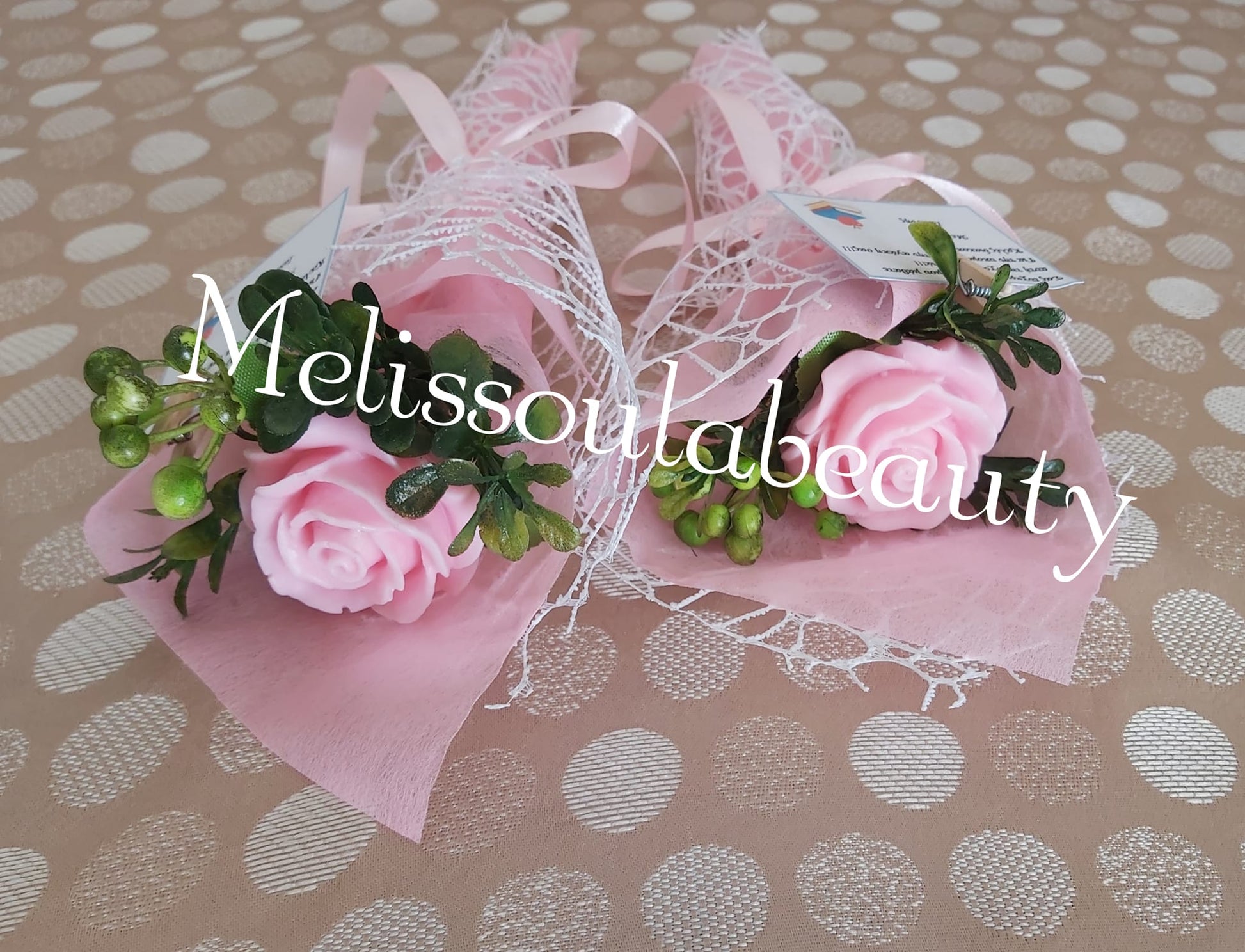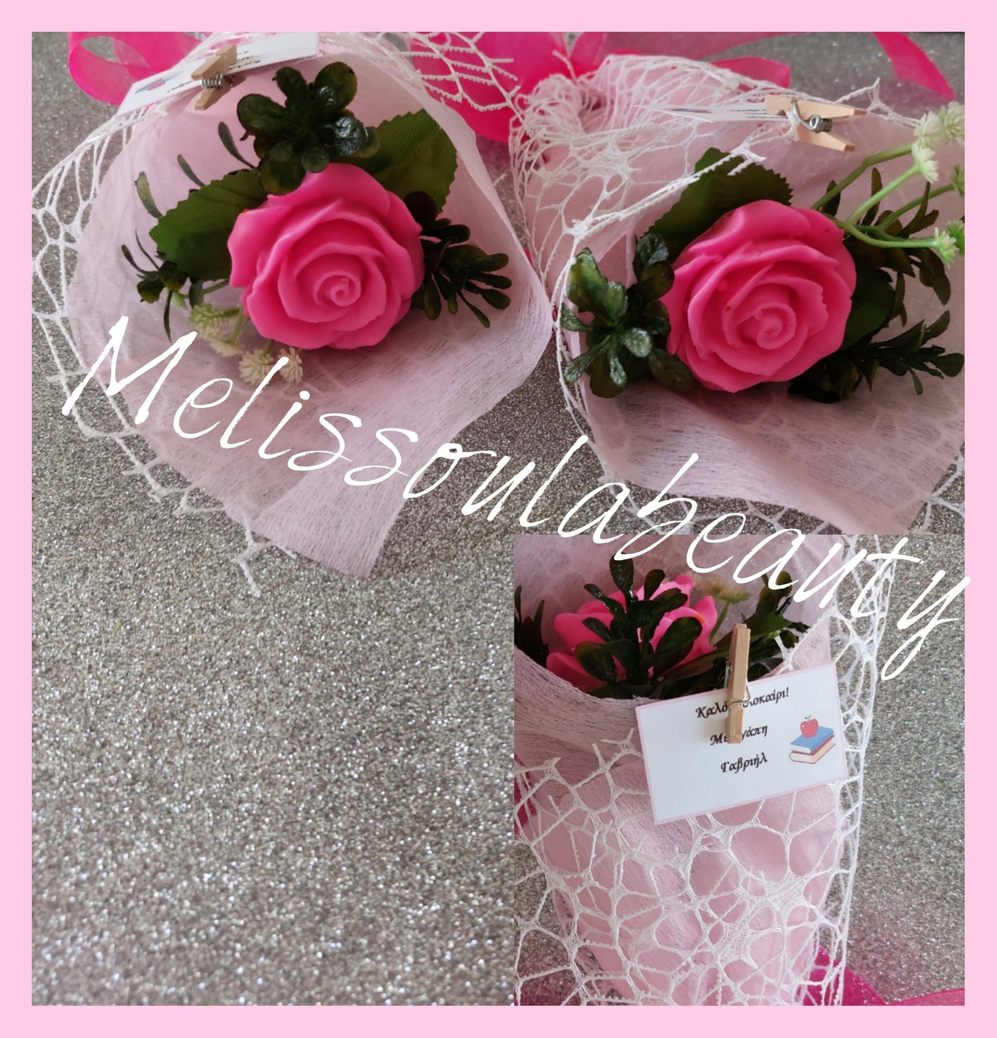 Η ανθοδέσμη αποτελείται από χειροποίητο σαπούνι σε σχήμα τριαντάφυλλου, με υπέροχο άρωμα που διαρκεί.