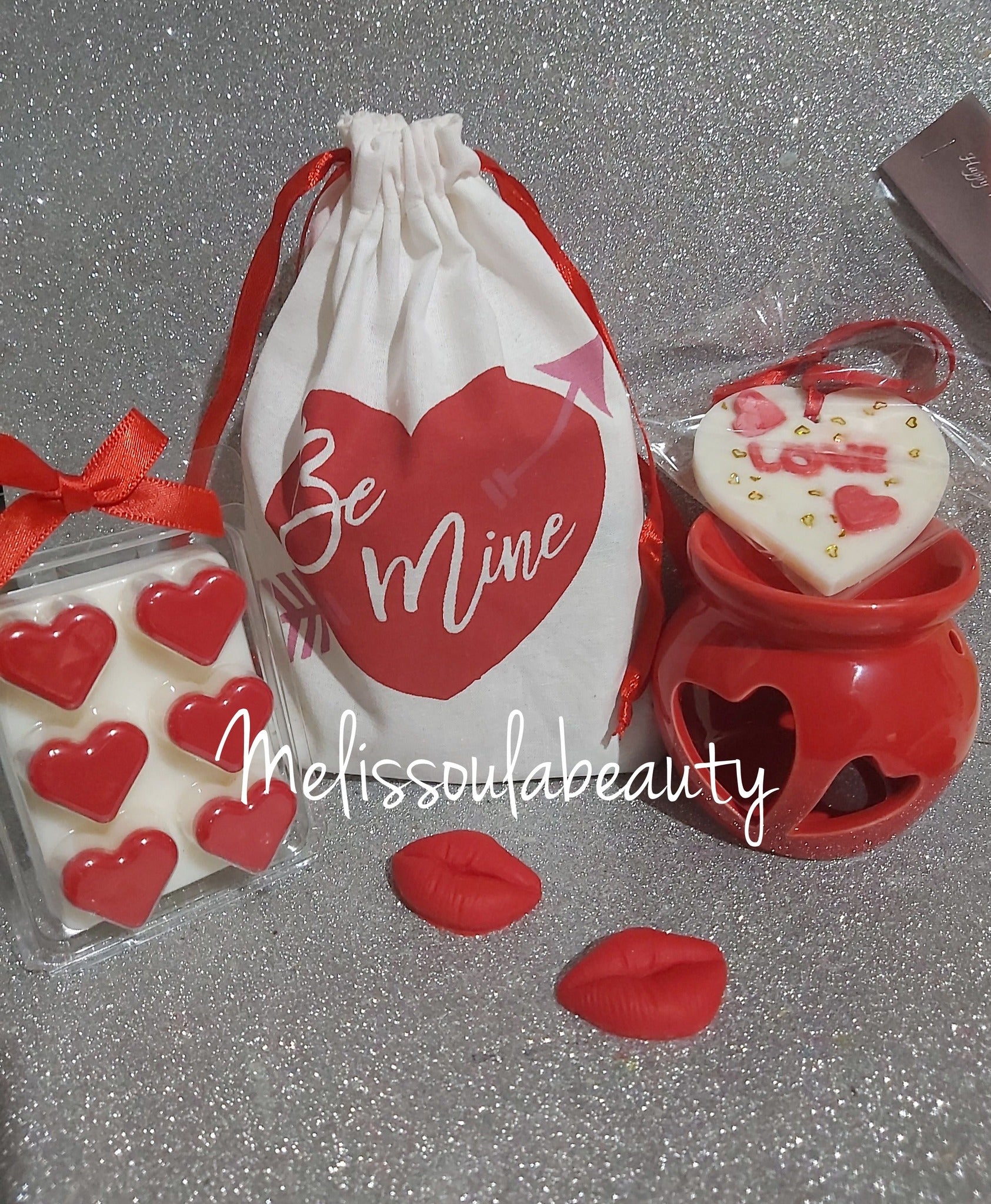 Σετ Be mine που αποτελείται από μια συσκευασία wax melts σε θήκη με καρδούλες,wax melts χειλάκια ,αρωματική ταμπλέτα κεριού ντουλάπας και κεραμικό αρωματιστή. Όλα αυτά μέσα στο όμορφο αυτό valentine 's πουγκί.